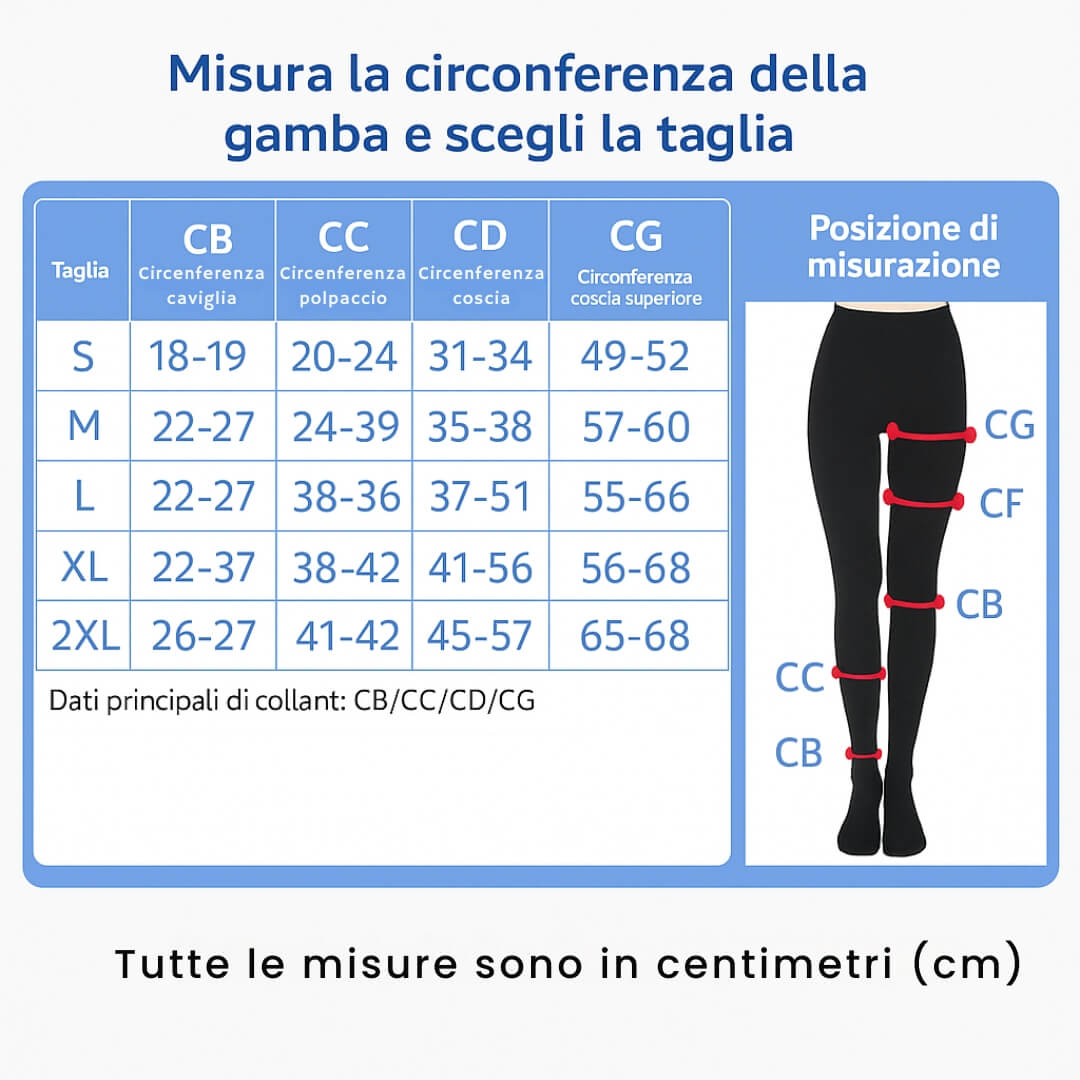 È fondamentale misurare la circonferenza del polpaccio e confrontarla con la guida alle taglie fornita. Alternativamente puoi confrontare con la tua taglia di scarpe. Una misura corretta garantisce l’efficacia della compressione e il massimo comfort.